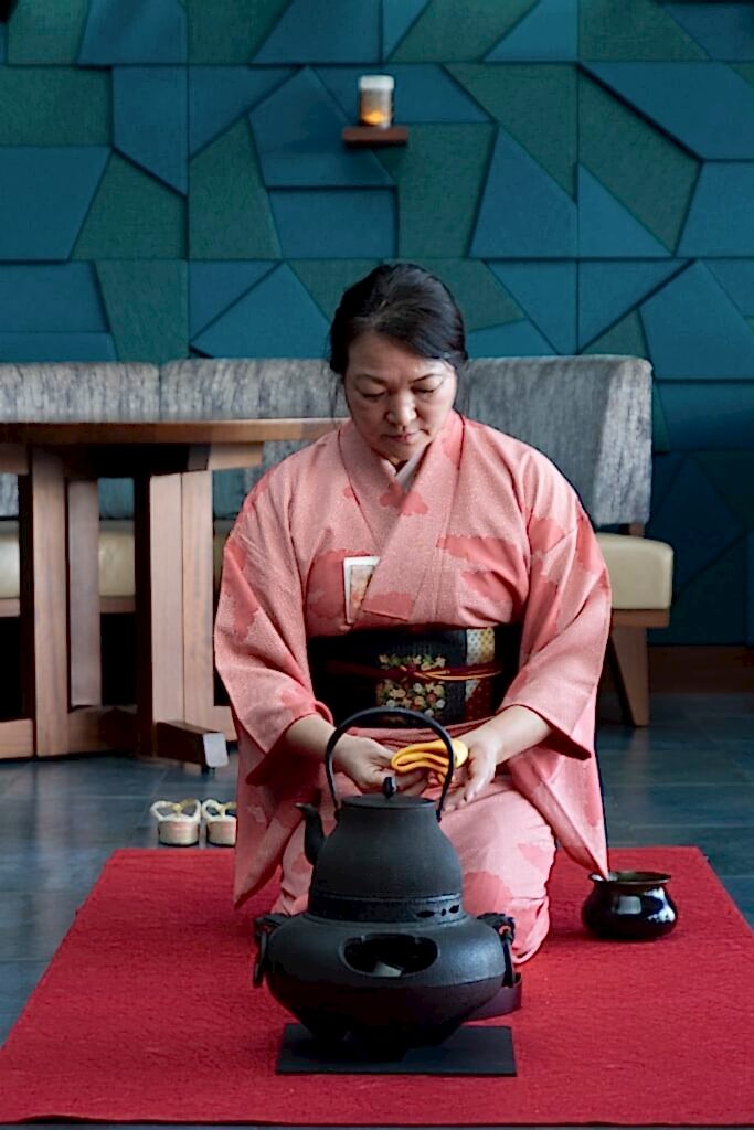 Daha sonra Chado’nun Japon Teamaster’ı geleneksel Japon müziği eşliğinde, kimonosu ile birlikte matcha çayını hazırlıyor.